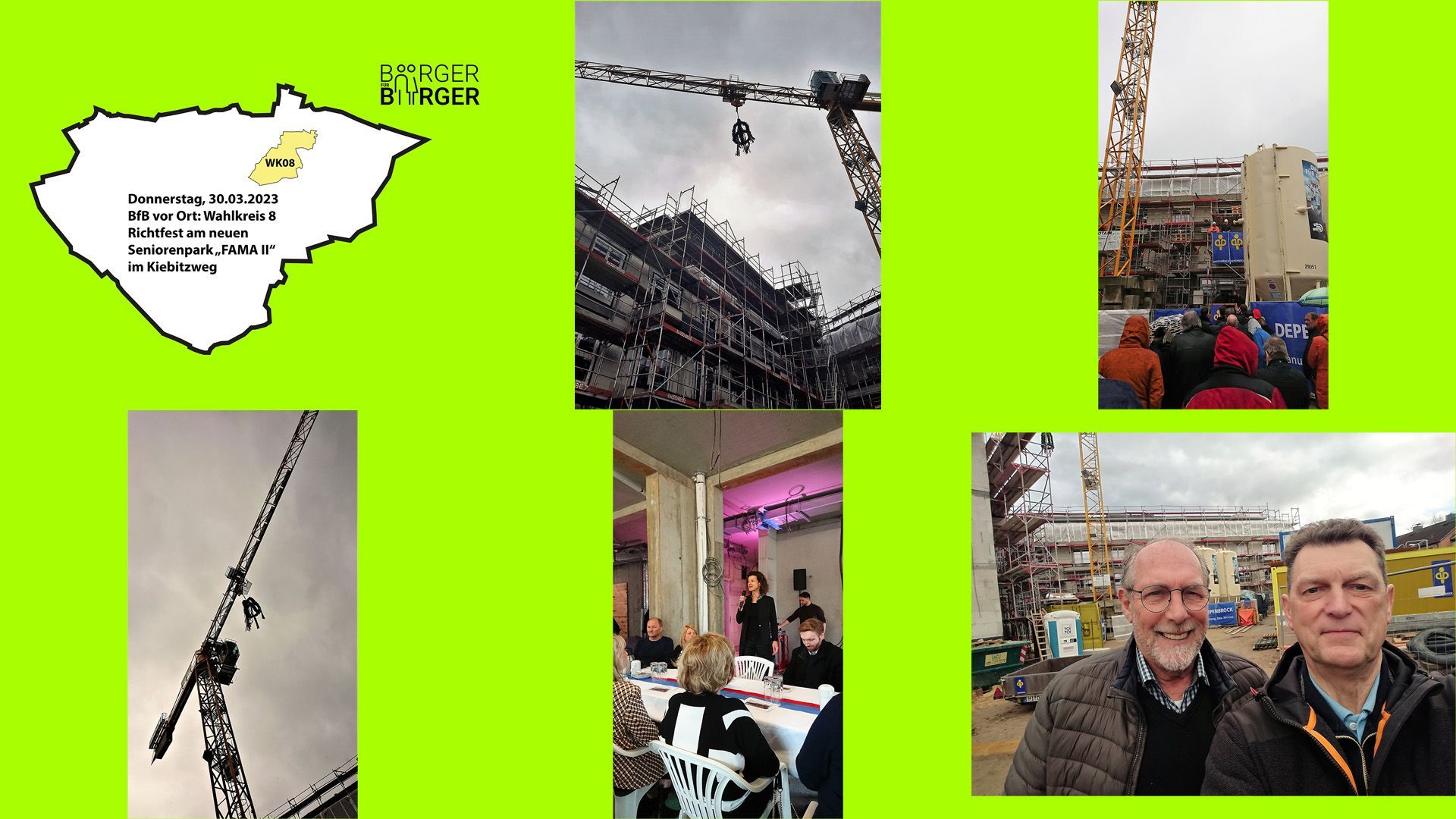 Vor über vier Jahren hatte die BfB eingeladen, diesmal hatte die Firma "Arnold von Mallesch" zum heutigen Richtfest am Seniorenpark im Kiebitzweg (in Wahlkreis 8) eingeladen. Der Einladung seitens der BfB waren Manfred Pfitzner und Ingo Meier gefolgt.